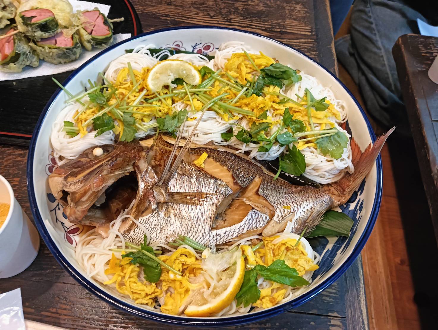 ゆでたそうめんを大皿に波形に盛り、その上にしょうゆ、酒、みりん、砂糖などで煮たタイの姿煮を乗せます。鯛を崩さずに煮るのは大変です。食べるときは小皿に取り分け、鯛の煮汁をかけて食します。