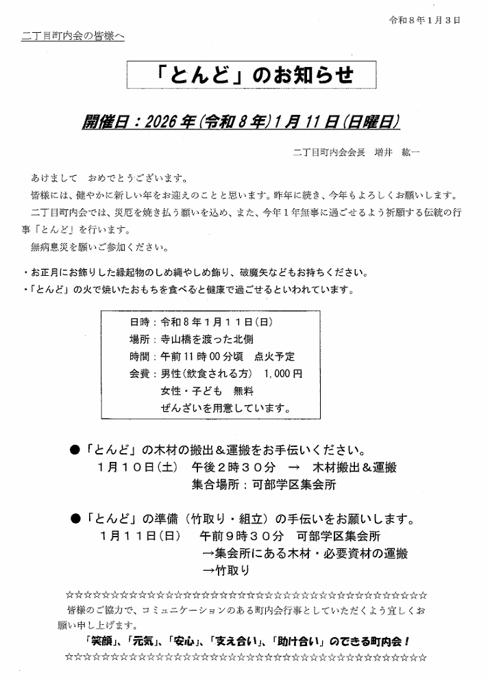 今年も四つの自治会・町内会でとんど祭りが行われる予定です。二丁目町内会、駅前町内会、新建自治会、東原町内会の皆さん、準備大変だと思いますが頑張ってください。
