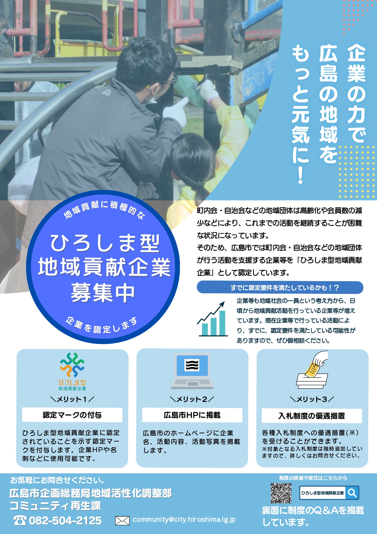 先日の「市民と市政」に掲載されていました。広島市では「ひろしま型地域貢献企業」を募集しています。可部学区内にある企業の皆様、ぜひともご検討ください。