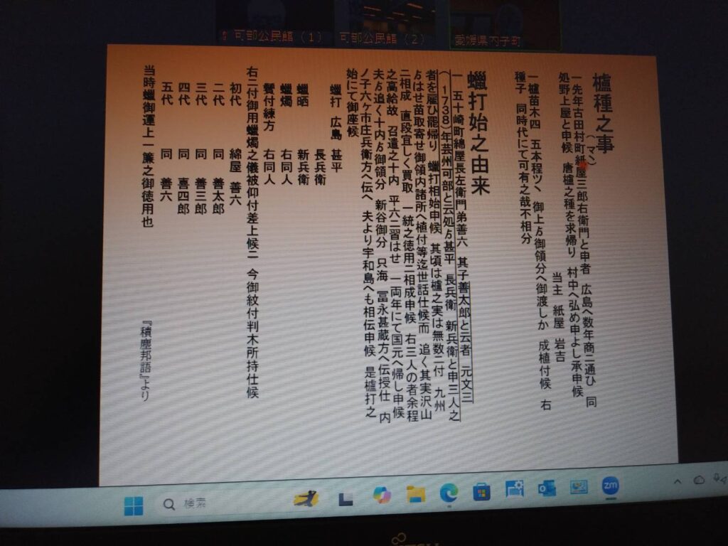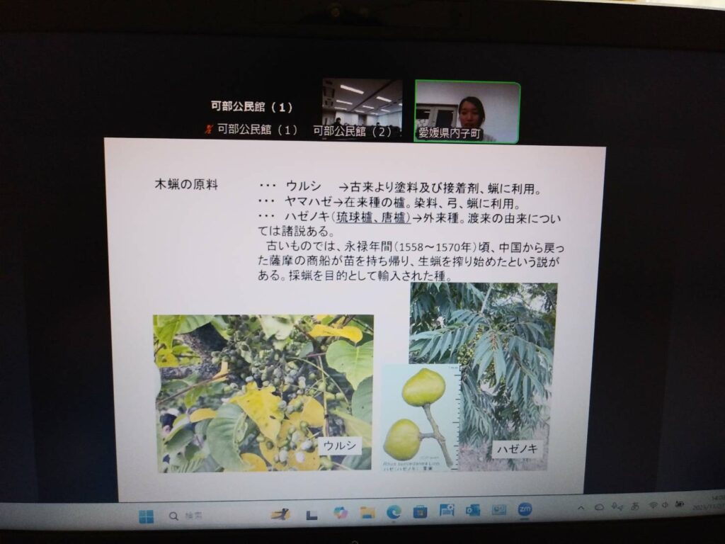 愛媛県内子町と可部公民館をZoomで結び、内子町役場 八日市・護国町並保存センター主任の池田あかりさんにご講演頂きました。