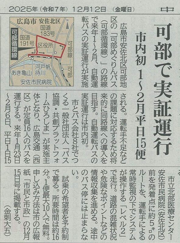 お知らせ 可部めぐりんバスニュース!!(画像をクリックしてください) 2025.12.12 「可部めぐりんバス」を使って 自動運転バスの実証運行が行われます!!無料試乗ができるそうです。体験してみませんか? Post Share Hatena Line Pocket RSS feedly Pin it ひろしま型地域貢献企業をご存じですか?(画像をクリックしてください) 前の記事