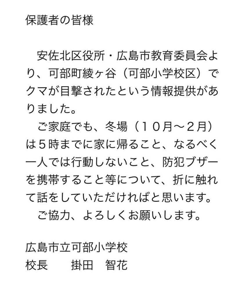 それにしても連日、全国的にクマ被害のニュースが後を絶ちませんね。可部でもクマの目撃情報が複数寄せられています。太田川から国道191号線を挟んで南原地区あたりにクマが複数頭出現しているようです。可部小学校からは、保護者宛てに注意喚起のメッセージが出されています。