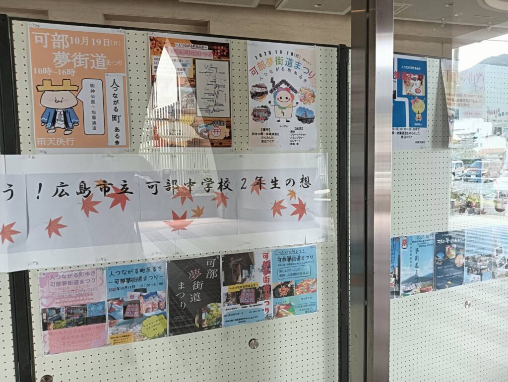 可部中学校2年生のみなさんが、10月19日の「可部夢街道まつり2025」のポスターをパソコンで作成しました。とても上手く構成されたポスターが安佐北区福祉センター1階ロビーに展示されています。ぜひ見に行ってみてください。