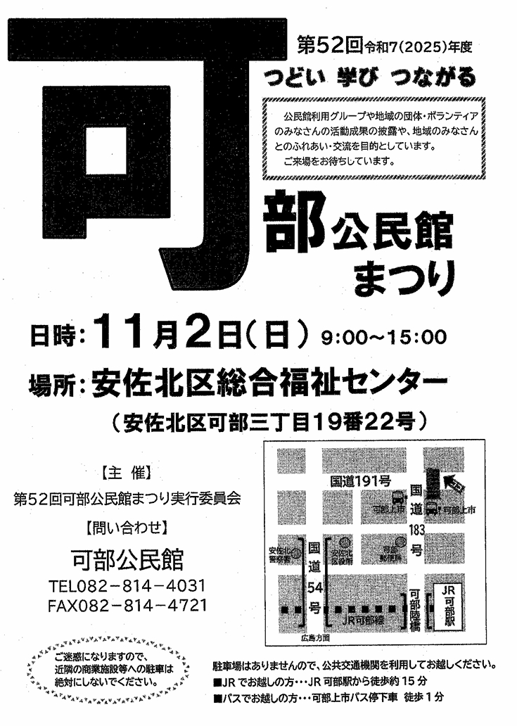 こんにちは。カベルモです。急に冷え込んだと思ったら、今日はとっても良いお天気となりました。可部夢街道まつりが終わったばかりですが、次は「可部公民館まつり」ですよ。可部の皆様、どうぞ足をお運びください。