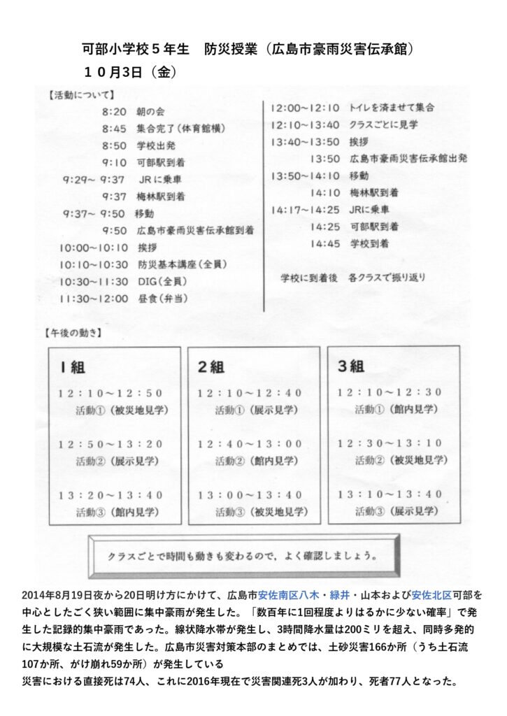 10月3日(金)、可部小5年生は防災学習の一環で、八木地区にある広島市豪雨災害伝承館を訪れました。可部駅からJRを使っての校外学習です。実際に土砂災害のあった現場を見て、災害の恐ろしさを実感したことでしょう。