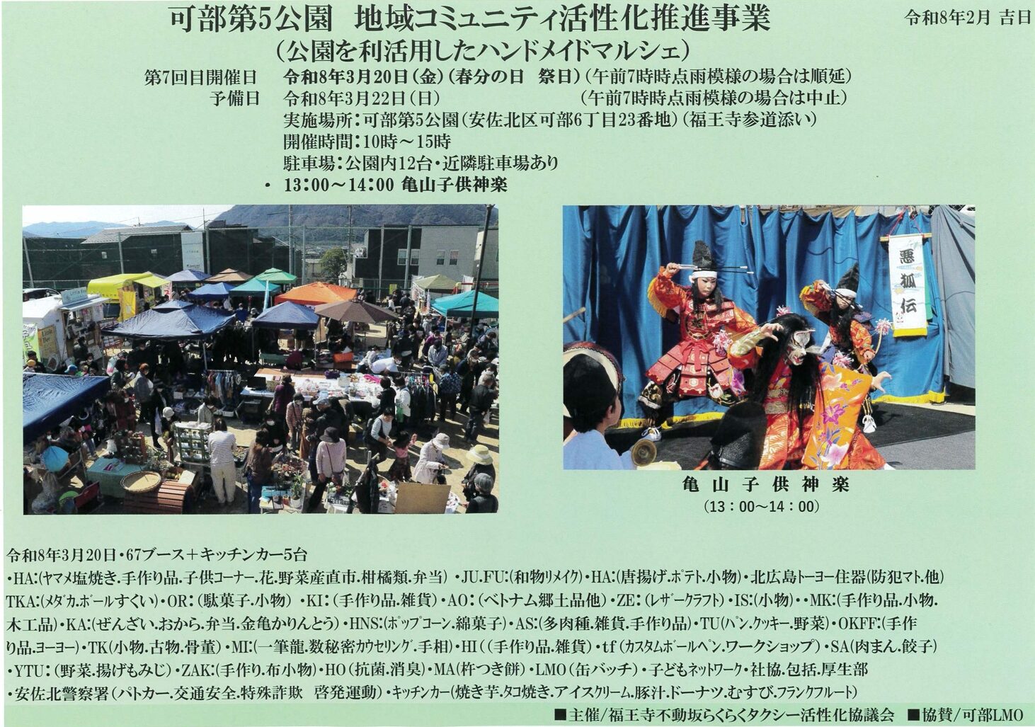 3月20日(金・祝)に「可部第5公園にて楽しいイベントがあります。みなさん、ぜひ足をお運びください。そろそろ暖かくなってきている春の一日、ご家族で楽しんでいただけると思います。亀山子供神楽の上演もあります。