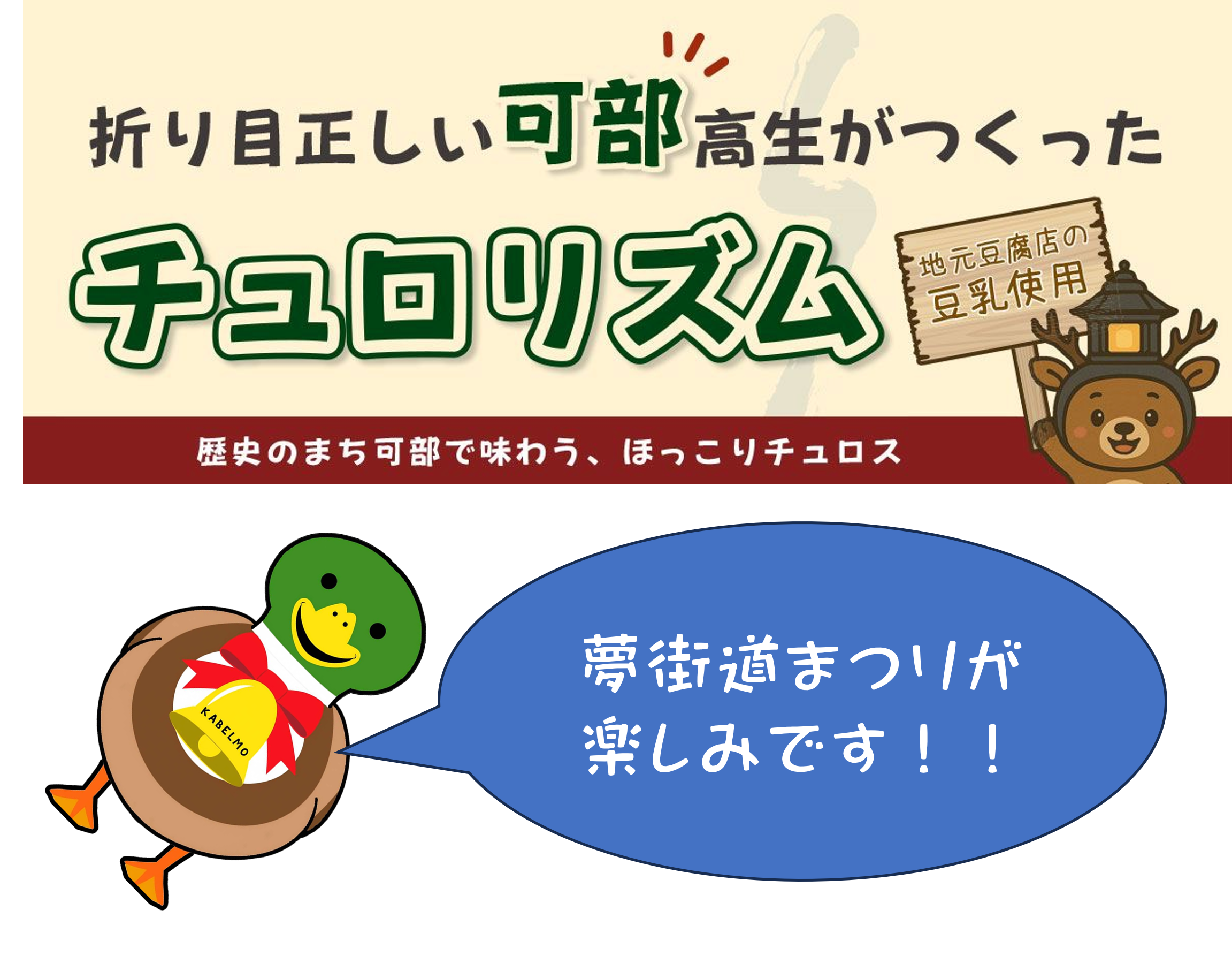 10月19日開催予定の「可部夢街道まつり2025」に、可部高校の生徒さんが夢街道をイメージした「チュロス」を考案しました。可部駅前町内会さんとのコラボ、そして可笑屋さんの協力で完成したようです。まつり当日、舟入堀市(明神公園)で販売します。数に限りがありますのでお早めに。