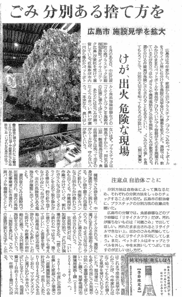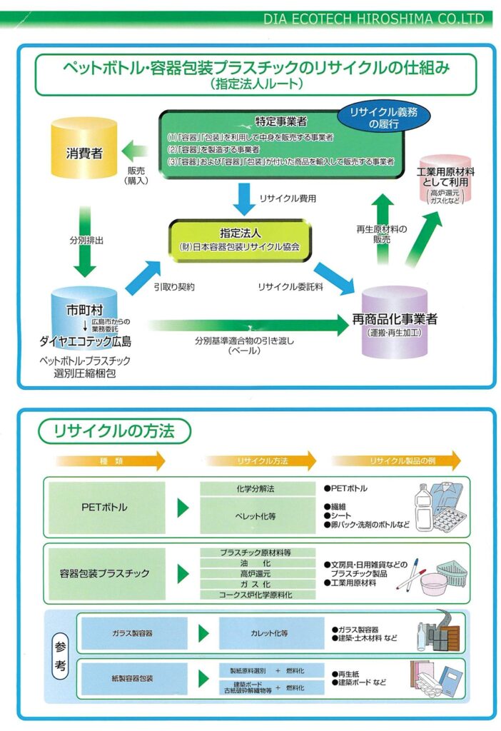 この会社は、広島市全域の一般家庭から分別排出、収集されたペットボトル及び容器包装プラスチックをリサイクルするために、選別・圧縮・梱包・保管し、再商品化事業者に引き渡す業務を実施しています。