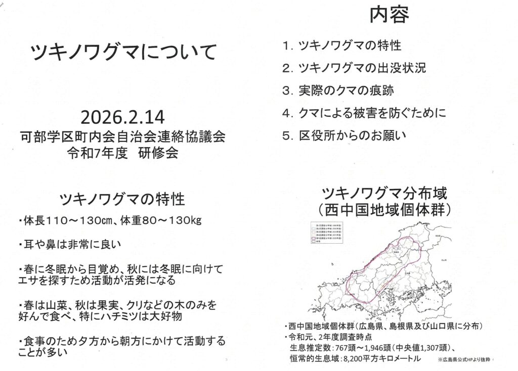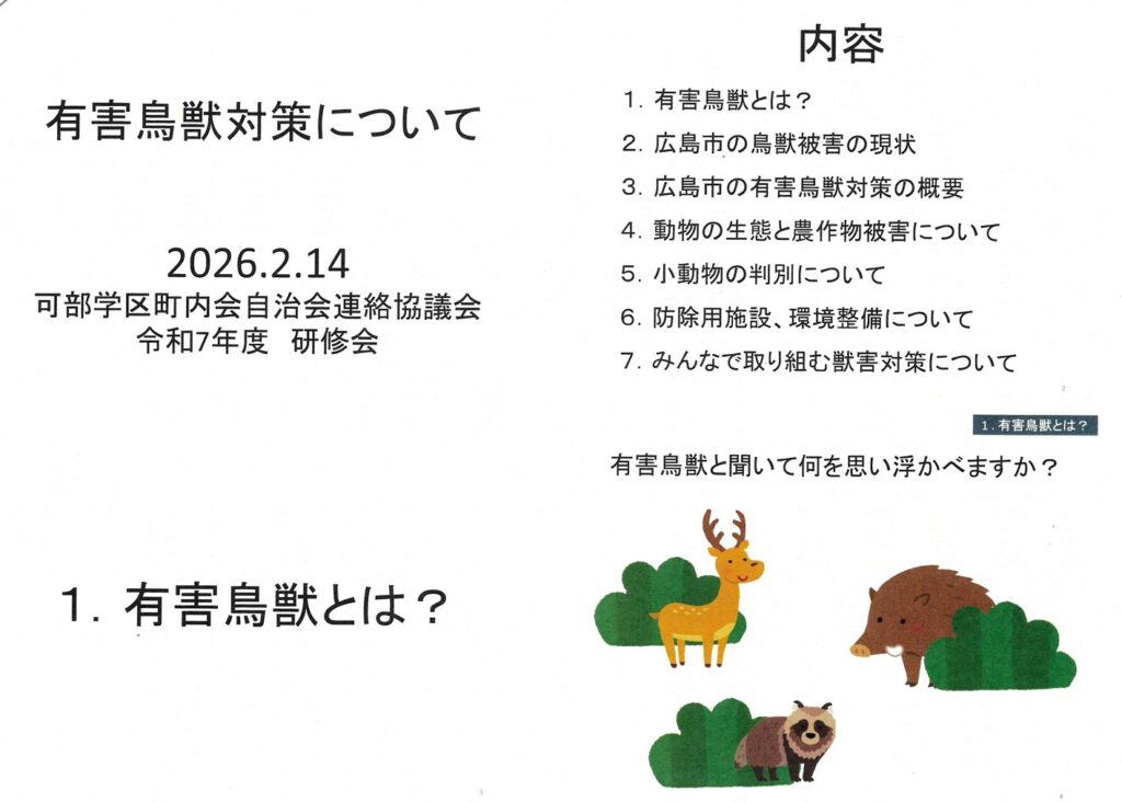 2月14日、可部学区自治連で有害鳥獣対策について研修会が開催されました。農林課の職員の方が講師で、わかりやすいお話をしていただきました。