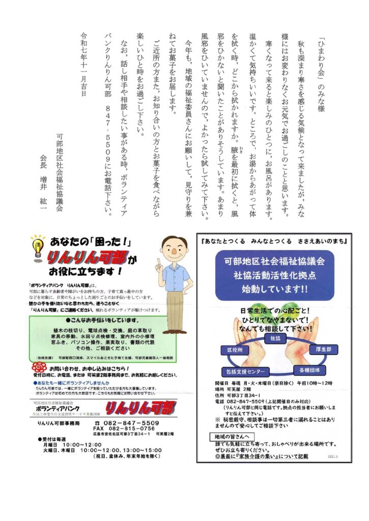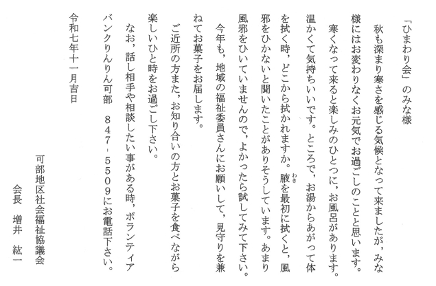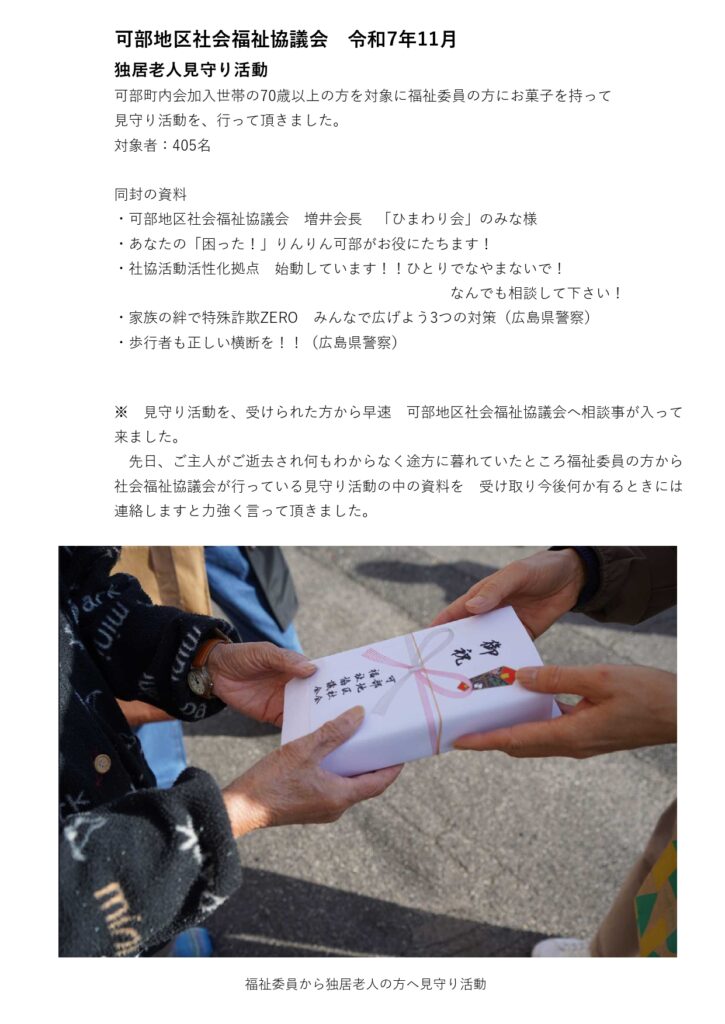 可部地区社会福祉協議会では、「独居老人見守り活動」を行っています。11月には可部町内会加入世帯の70歳以上の方を対象に、福祉委員の方によるお菓子を持っての見守り活動をが行われました。