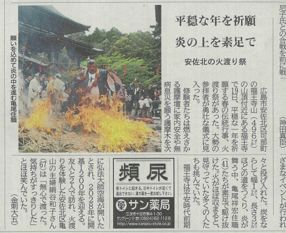 こんにちは。カベルモです。昨日の19日に、可部福王寺にて恒例の火渡り祭が開催されました。迫力のある火渡りの様子を一目みようと多くの参拝者でにぎわいました。今朝の中国新聞にも掲載されていましたね。