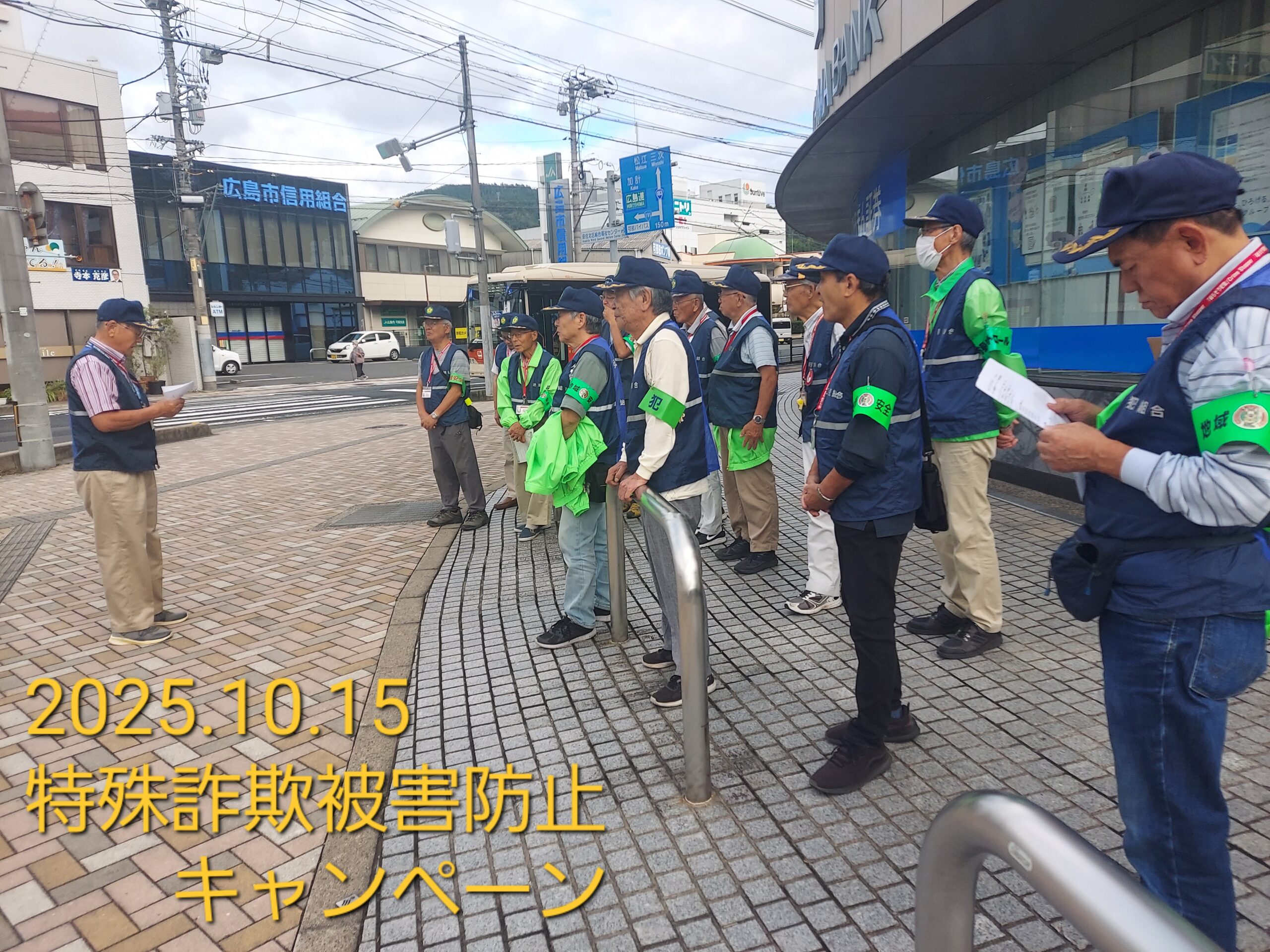 10月15日 「年金支給日」恒例の「特殊詐欺被害防止キャンペーン」を広島銀行可部支店・広島信用金庫可部中央支店・JA可部・可部郵便局及びサンリブATM前で実施しました。